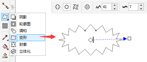 2. 在选中图形的状态下,使用变形工具应用“拉链变形”,单击属性栏上的拉链变形按钮,然后拖动鼠标以确定拉链效果的振幅。