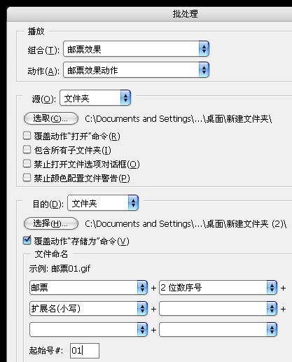 19、“文件——自动——批处理”弹出自动批处理对话框,选择动作组为“邮票效果”,动作为“邮票效果动作”;“源”文件地址选取你所需要改变的文件的文件夹地址;“目的”件地址选取你所需要存储改后的文件的文件夹地址,勾选“覆盖动作存储为命令”选项;在“文件命名”项内为改后的文件命名。具体设置可参考下图。(图7) 点选“好”开始动作的批量执行。