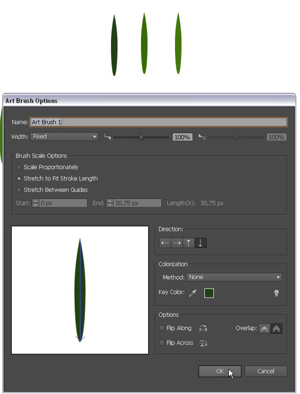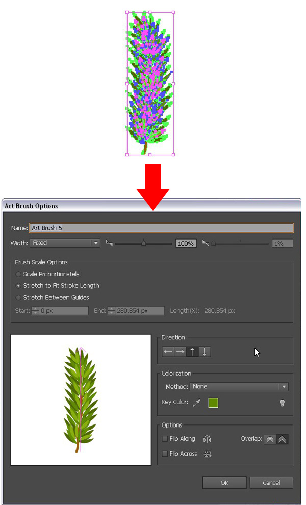 现在,用刚刚做好的树枝做一个笔刷。选择枝干的所有部分,执行【对象】>【扩展】,然后,把杉木树枝拖到画笔面板里,再创建一个【艺术画笔】。同样根据自己的喜好设置笔刷方向,并保持其他选项为默认值。