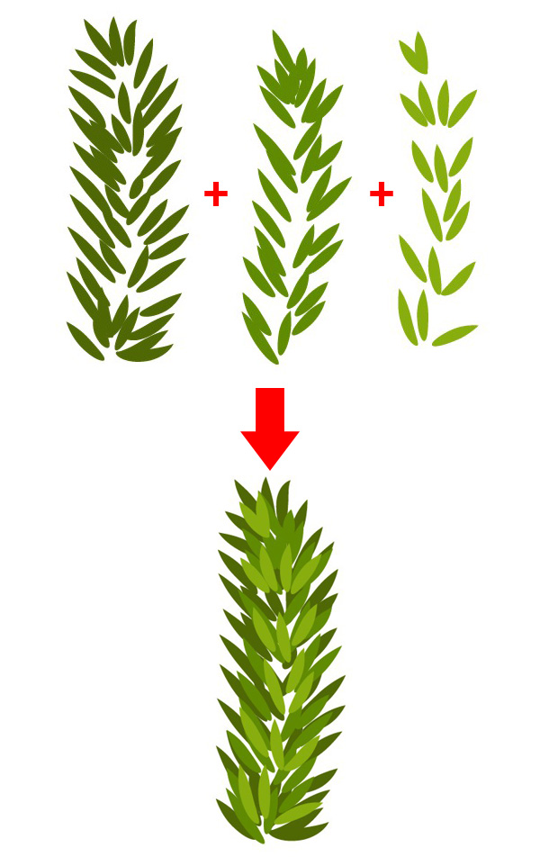 用你创建的颜色最深的画笔,开始画针叶。在两侧都要绘制不同方向的针叶,中间也要补充一些。然后用较浅的画笔在上面画第二层。最后,用最浅的画笔,这就完成了针叶的绘制。