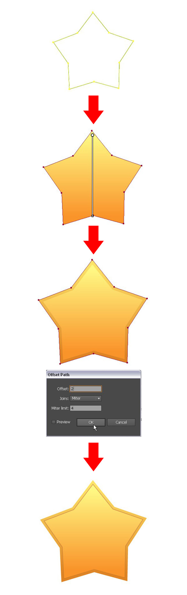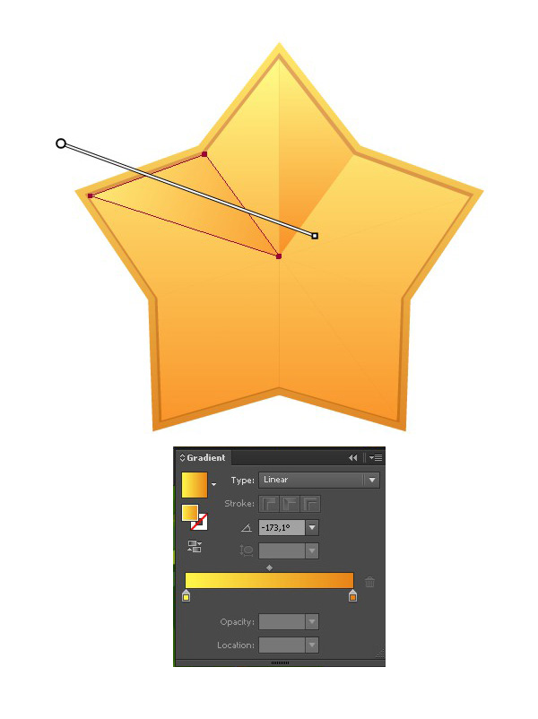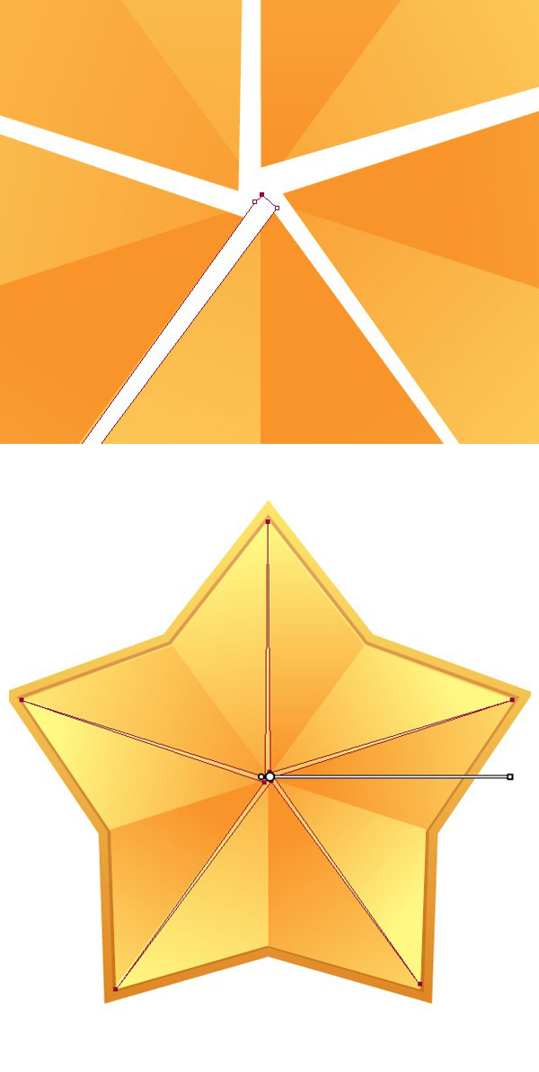 用一个【星形工具】画一个五星。按【Control】键,改变五个角的锐度,让它看起来更圆润一些。用一个顶部黄色底部橙色的线性渐变来填充它。