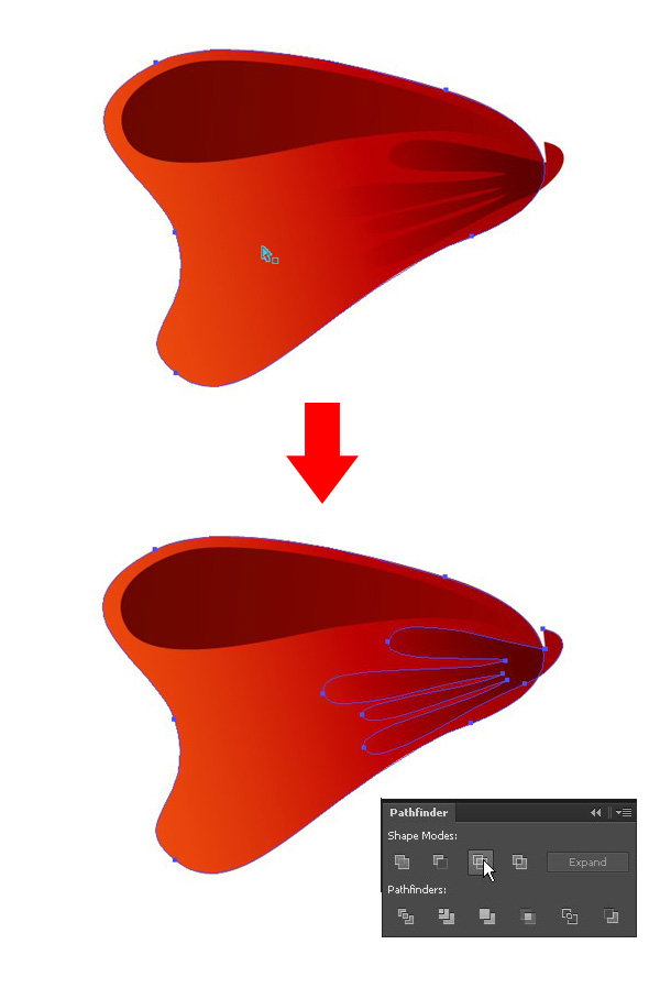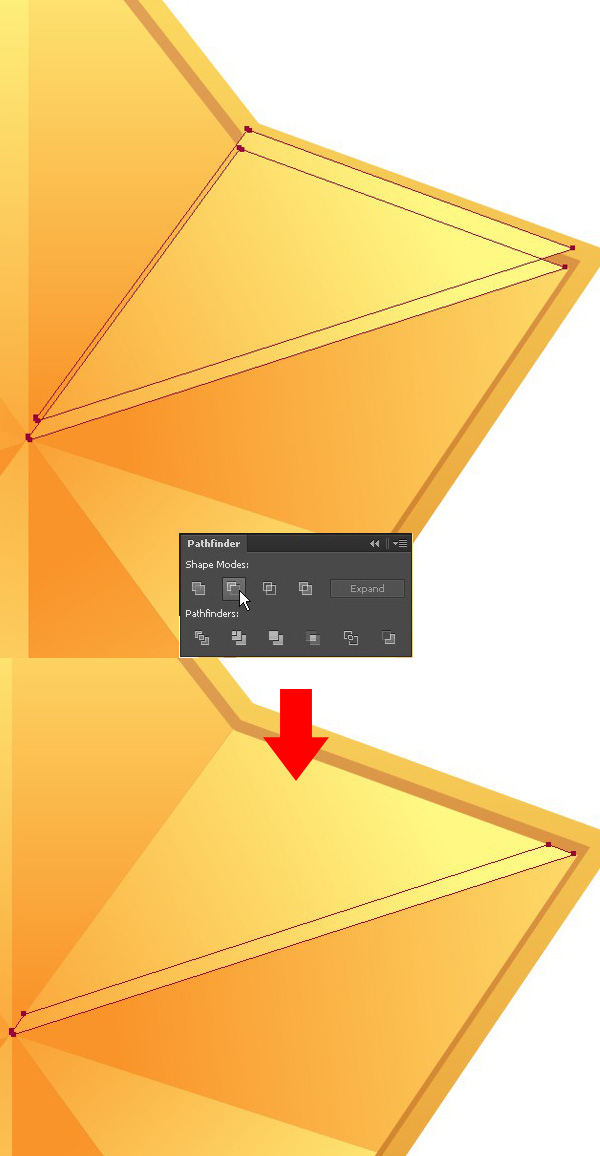 复制星星的三角形部分两次,把上面一层稍微移动一点。选择两个形状,点击【路径查找器】面板中的【减去顶层】,切断不要的部分。得到下面那个形状。