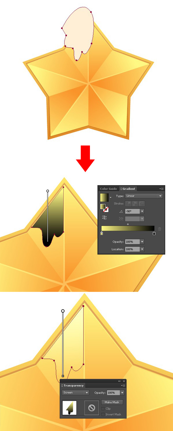 现在,让我们在五星的角上画一些随意的形状,添加一些反光效果。通过【路径面板】裁掉边缘。然后用一个黄色到黑色的线性渐变填充它,改变【混合模式】为【滤色】。同理添加几个这样的形状。
