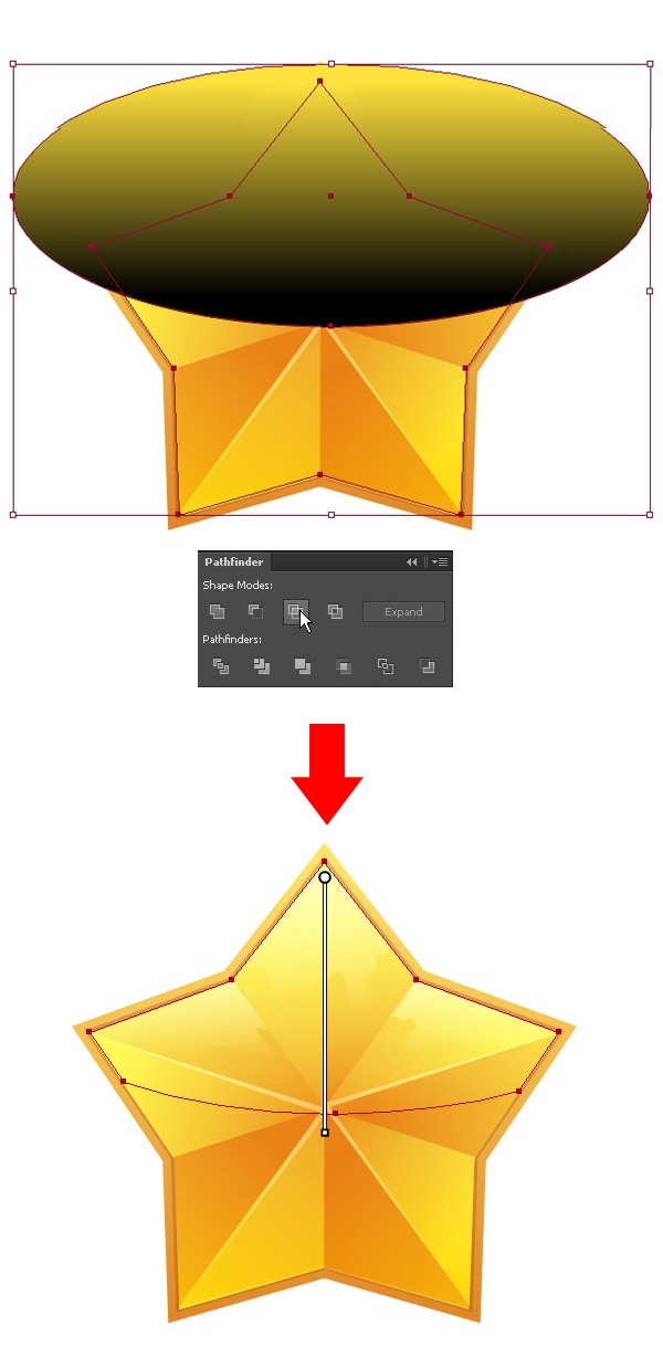 添加一个高光:在五星的顶部画一个椭圆形,点击【路径面板】里的【交集】进行裁剪,并将【混合模式】改为【滤色】。