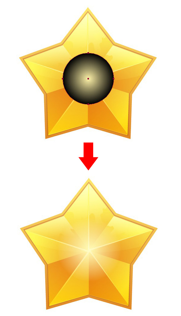 最后,在五星中间画一个圆形,用一个中心浅黄边缘黑色的径向渐变填充它,设置【混合模式】为【滤色】,制造一个发光的中心。