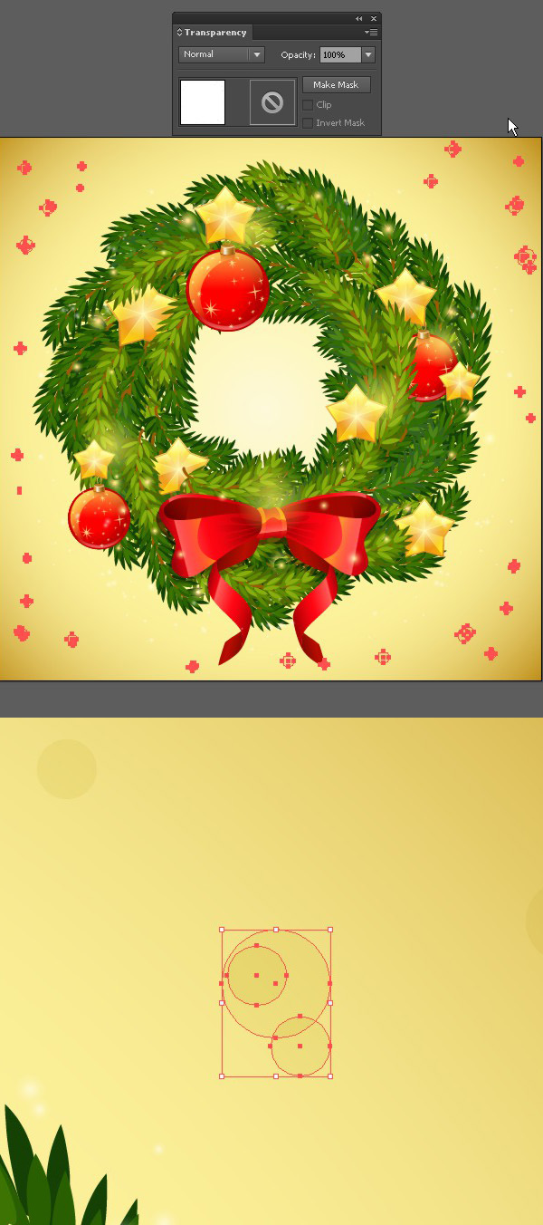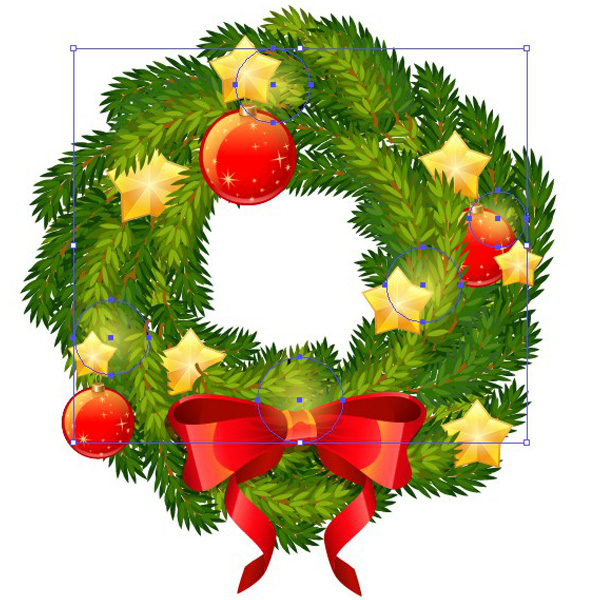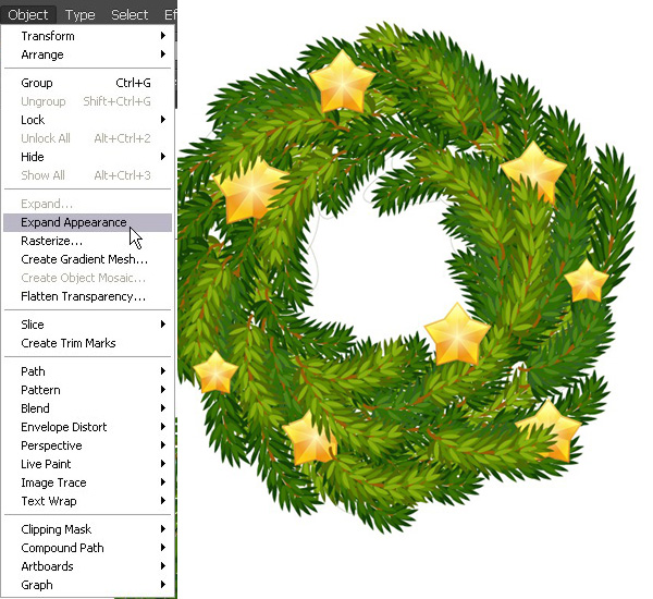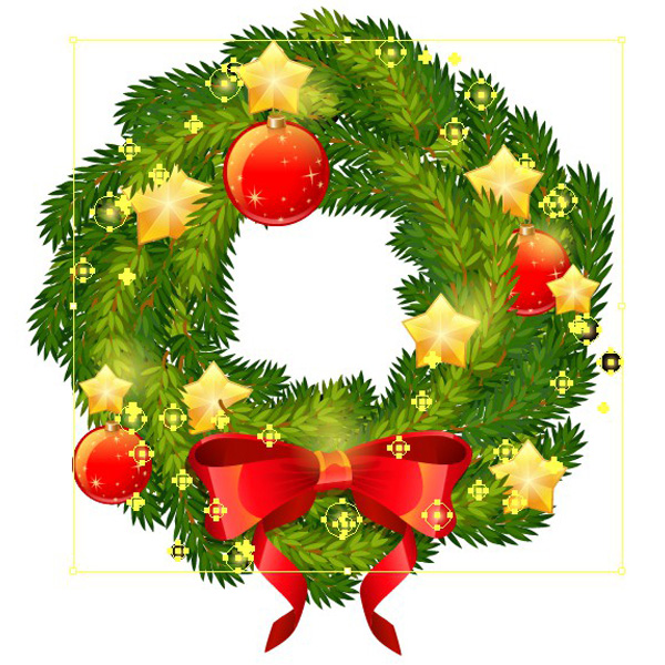 组合五星的所有部分,复制多个副本,并把他们点缀在花圈上。移动一些星星下的枝叶,用枝叶遮住星星的某些部分。最后,选择画面上的所有东西,执行【对象】>【扩展】。