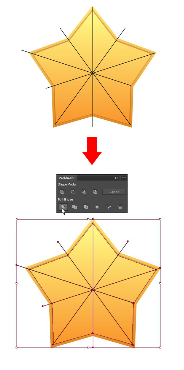 现在,我们需要给星星加几个面,使它更加立体。让我们把它切开!用【直线段工具】(),从星星的每个角画出一道线,让线条把星星对半分。选择星星和所有的线,点击【路径查找器】面板里的【分割】。