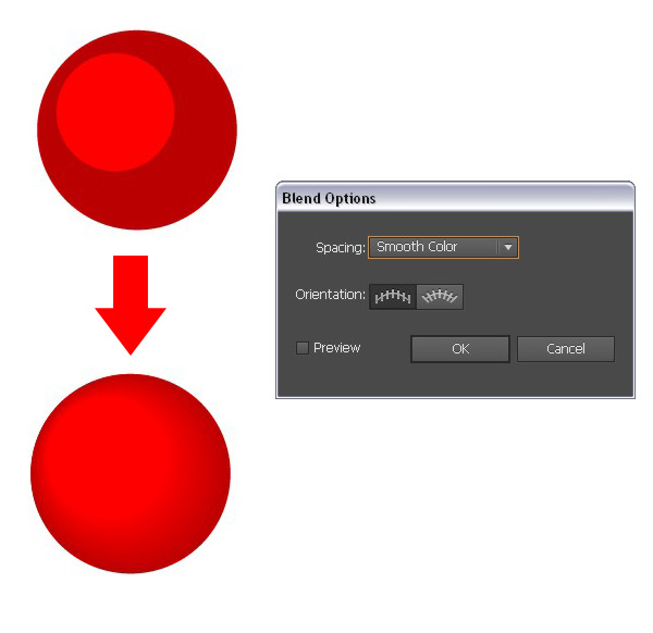 玻璃小球是最为流行的圣诞用品之一,所以我们也来绘制一些。首先,我们绘制一个暗酒红的圆(按住Shift键可绘制完美的圆形)。在上面添加一个较小的鲜红的圆,将其置于左上方。选择这两个圆圈,执行【对象】>【混合】>【建立】。在【混合选项】里选择默认的【平滑颜色】,这样你就得到一个理想的径向渐变效果。