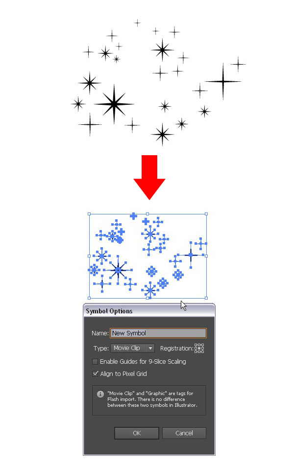 按照你自己的喜好排列星星的位置,将许多星星组合成一个图案。然后,把你的星星们拖到【符号面板】,在弹出窗口中保持默认值设置。
