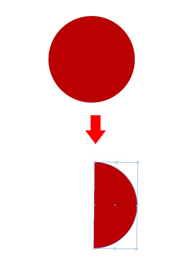 现在可以把图案装饰到我们的球上了。这并不像看起来那么复杂。复制玻璃球的那个基础形状(你可以在混合组里找到),将其【置于顶层】(Shift-Control-]),用【剪刀工具】(C),第一下点击顶部的锚点,第二下点击底部的锚点。删除左半球,因为我们之后的效果只需要用到这右半球。