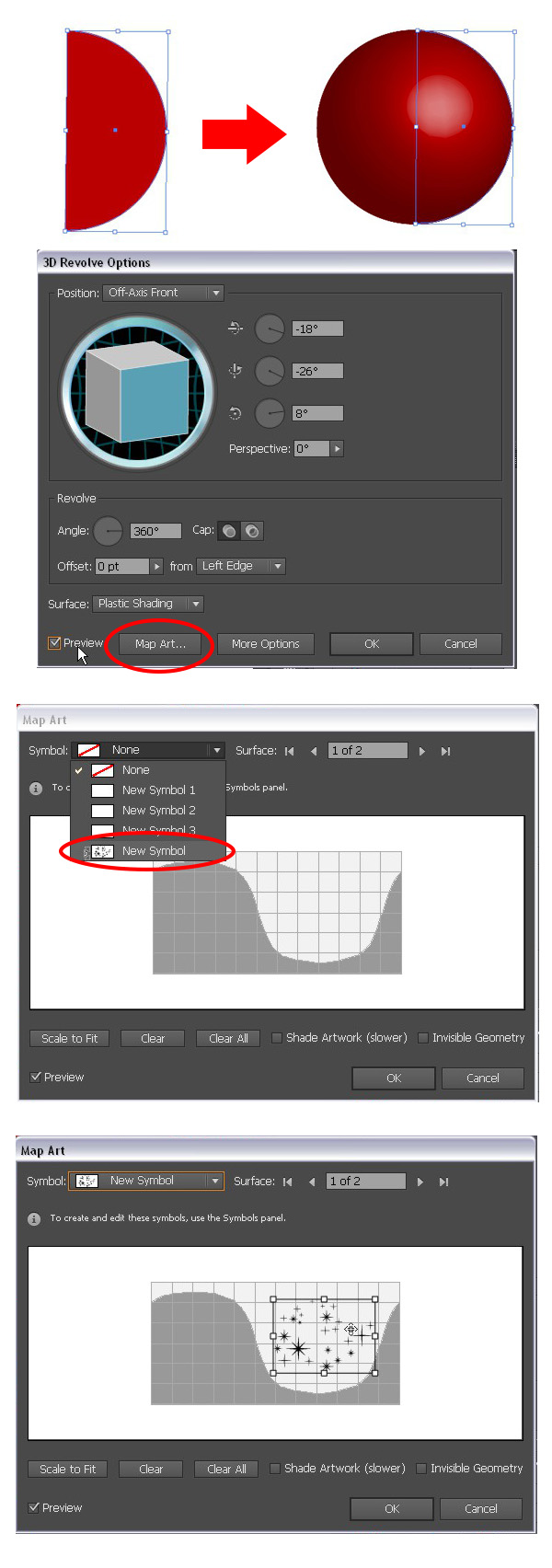 点击【贴图】按钮,进入【贴图】的选项。接下来:在下拉菜单里选择【符号】,在列表中找到并选择刚才创建的符号。将贴图图案调整到你满意为止,单击OK(确定)。瞧!球体图案准备好了。【扩展】创建出的球体,现在你可以删除不需要的部分,留下星星。