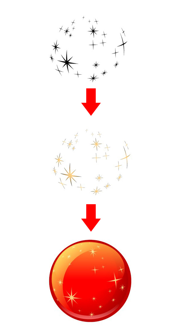 星星扩展好之后,你就可以给它重新着上闪亮的金色,然后放到我们之前创作的球上。