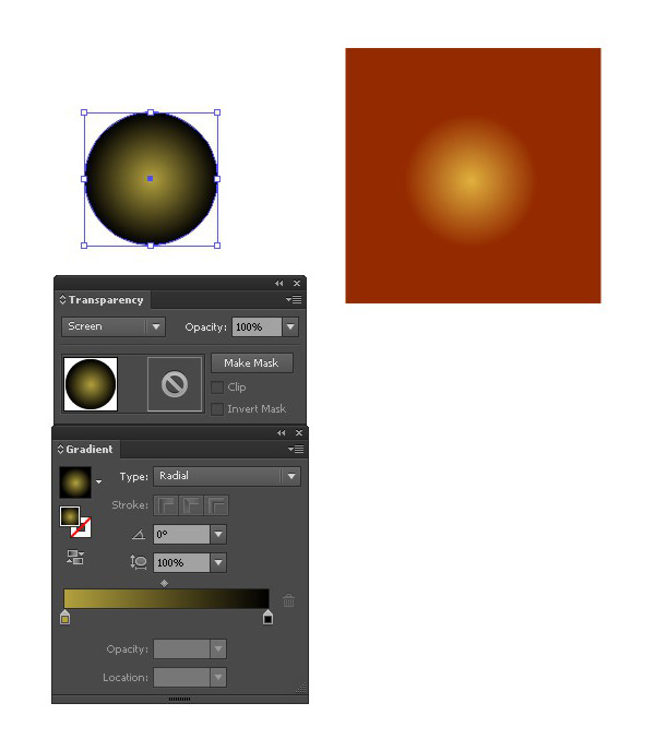 为了使画面更生动,闪亮,我们来做一些柔和的光晕。画一个圆,并用边缘黑色,中间浅黄色的径向渐变填充它。改变【混合模式】为【滤色】。把光晕放到对比色的背景下,你就能比较清楚地看到它的样子。