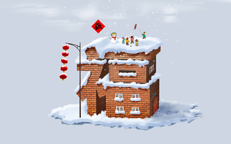 步骤12:添加灯笼,玩耍的小孩,注意添加小孩在屋顶上的阴影和灯笼上的积雪,是画面更协调;