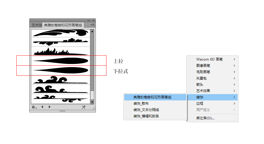 然后把我们即将要用的艺术画笔都调出来。打开“画笔”面板,在右上角的下拉选框中选择【打开画笔库>装饰>典雅的卷曲和花形画笔组】,在这一组艺术画笔中选择【上拉】和【下拉式】这两种画笔。大家可以从画笔的基本预览形态上看到这是画植物叶面的最佳选择。