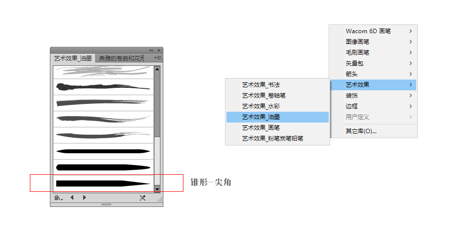 再从【艺术效果>油墨】中找到【锥形-尖角】。这是画植物的枝干时所需要用到的画笔。