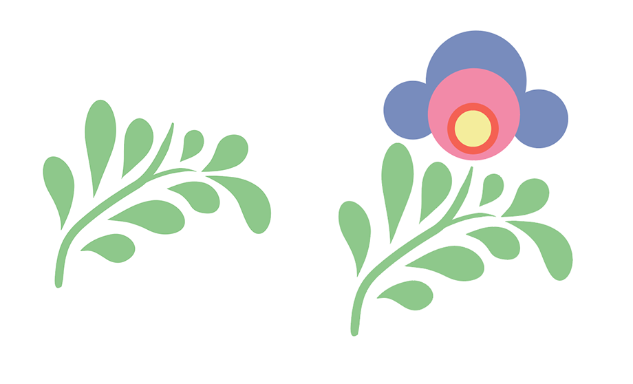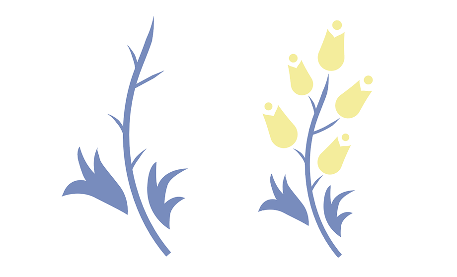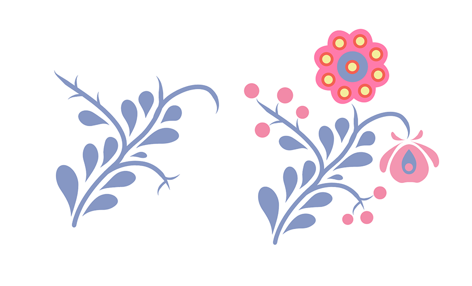 花朵的形状可以千差万别,但整体的风格要和谐一致,叶片的部分稍微做了一些变化,这里不仅可以用艺术画笔去绘制,还可以用钢笔工具来完成。