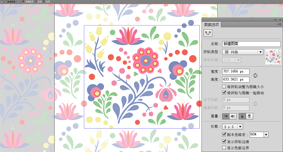 我喜欢在图案工具里操作,选中所有的图案,进入【对象>图案>建立】,这时蓝色框内的即是单元内的图案,而外围的部分则是根据这个单元内图案平铺而成的纹理图案,可以随时根据效果进行实时调整。