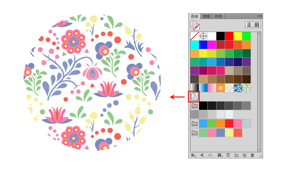 这时会在色板中看到你最新制作好的图案,当你双击这个图案的时候,又会进入到图案编辑,就像上一步那样,点击完成后保存新的修改。