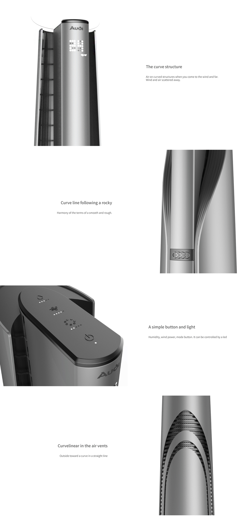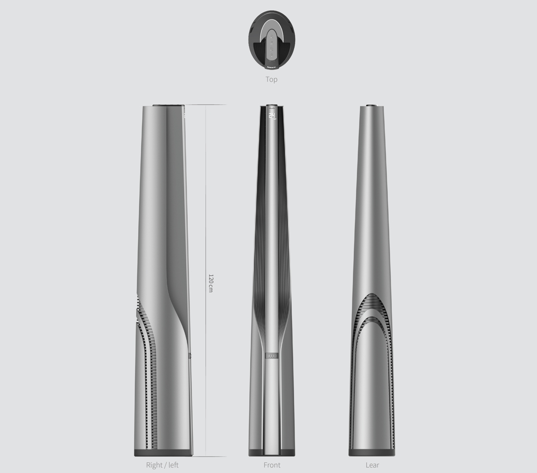 Audi奥迪空气净化器设计,推荐企业家居大户型使用 奥迪推出了一款空气净化器,由设计师Hyeon Seok Kim 和PDF Haus联合设计。得益于奥迪多年来的汽车美学,这款空气净化器外观较为硬朗,环状的弧线型出气口又增加了几分柔美,不仅丰富了视觉上的细节,在出气时更有利于向外扩散。它的操作按键非常简单,工作状态皆以LED灯显示。它的体型较为巨大,高达120cm,比较适合企业或大面积的住房。