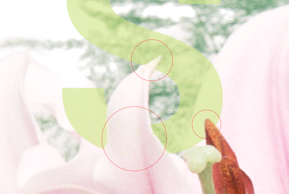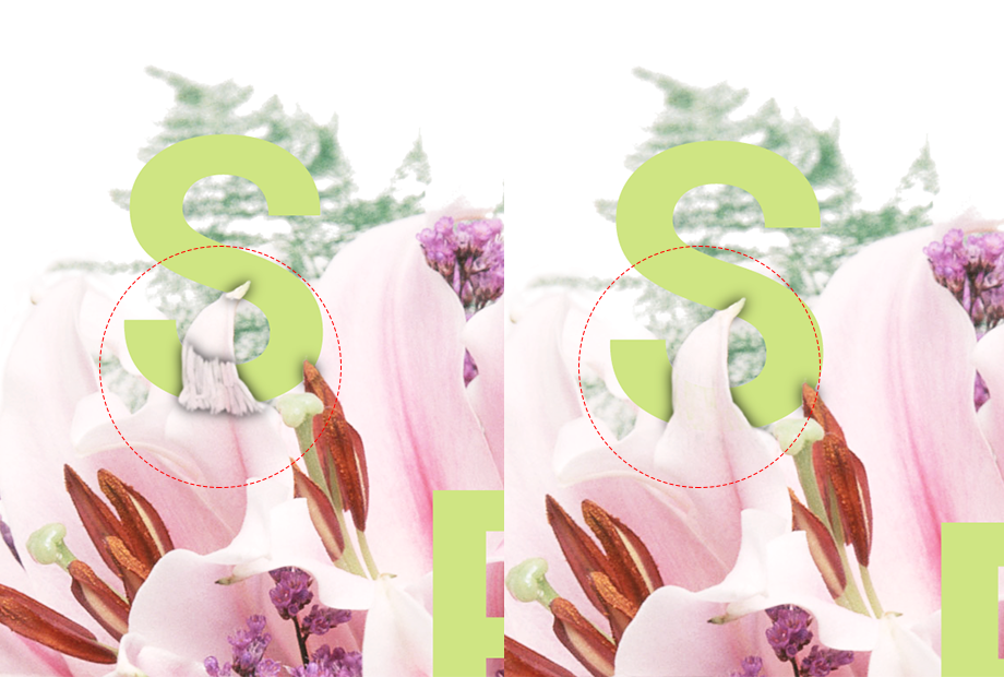 为了看清两个图层之间的遮挡关系,我们稍降低文字的透明度。从“S”这个字母开始,放大细节,我用白色画笔涂抹了三个部分,这三个部分让S上方的花朵显露了出来。记得,白色画笔是画在最上面花朵图层的黑色蒙板上。