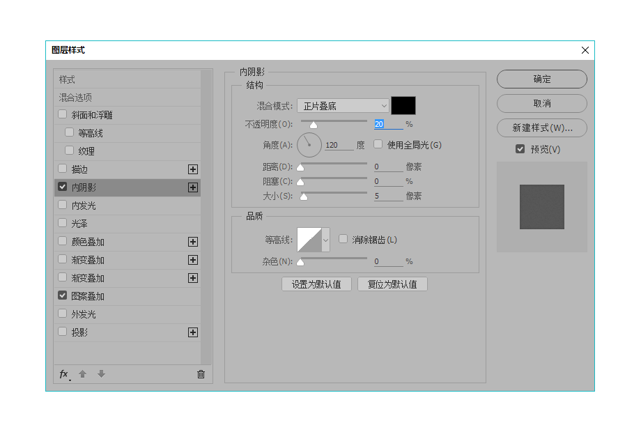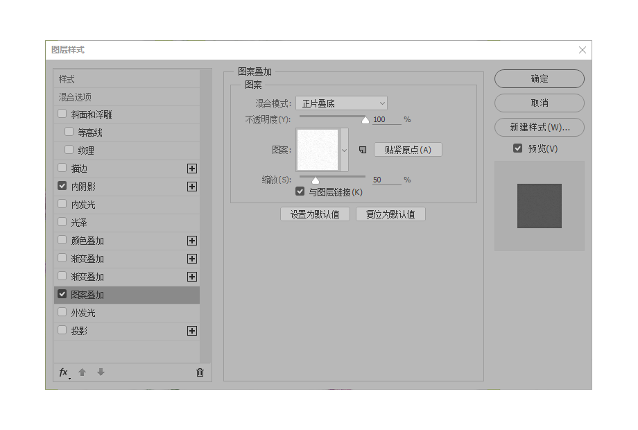 为了增加一点质感,给文字和外框的部分可以增加“内阴影”和“图案叠加”的图层样式,其中图案叠加里增加一种非常微妙的叫做“水彩纸”的纹理,若有若无。