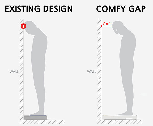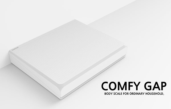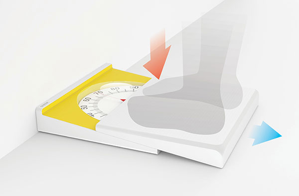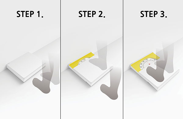 也许大家都会太注意,一般为了节省空间,大家都会把电子称放在墙角下,在量体重的时候不会再次挪动它,而是直接站在上面称体重。这样的话就难免会在地头的时候,头部磕在墙上。为了不免这样尴尬的事情再次发生,Youngkwang Cho设计了这个滑动电子秤。它可以在有用户站在上面的时候,向外滑动有一定的距离,将藏在里面的显示盘露出来,这样一来既可以在没有使用的时候减小秤的面积,又可以在使用的时候避免用户的头磕在墙上。
