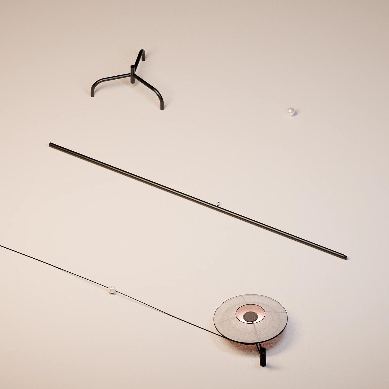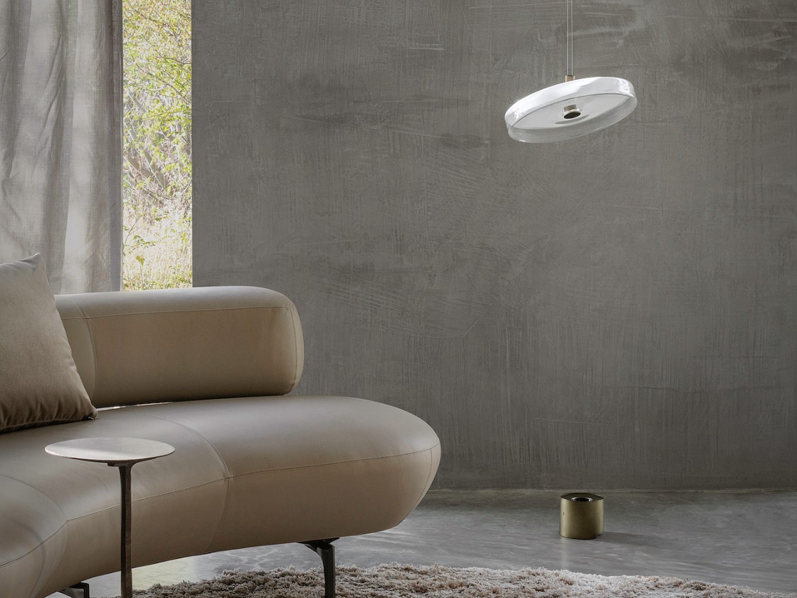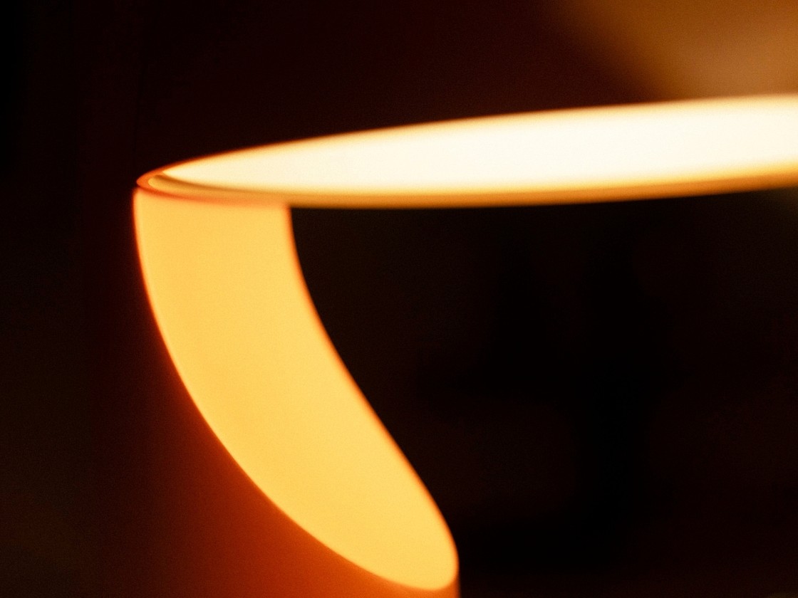 Luno 是一款重新设计的吊灯产品设计,其有着极强的装饰美感以及氛围营造美感,具体的光影设计方面,光线由地面或桌面的圆柱金属灯体向上投射,穿过负空间,在光环上形成温柔漫射。