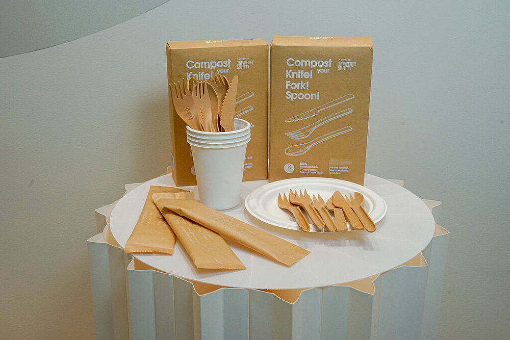 一套环保餐具设计,仅使用天然原材料:米糊凝块、大豆蛋白和木薯淀粉。这些原材料作为农业副产品大量存在,并且不与主食的生产竞争。餐具套装采用节能的热熔注塑工艺生产,不使用任何化学溶剂,而且产品在未开封的包装下可保存两年。