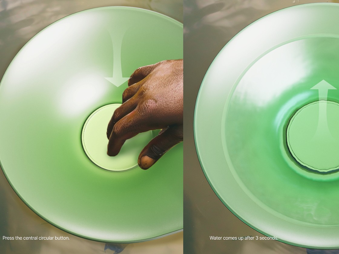 这是一款概念净水器产品设计,专为落后地区而设计,设计师采用了仿生形态设计,其仿生对象为莲叶形态。具体的净化功能设计为顶部太阳能板为内部过滤系统供电,中央滤芯结合超滤膜与活性炭层,可去除细菌、重金属与异味。