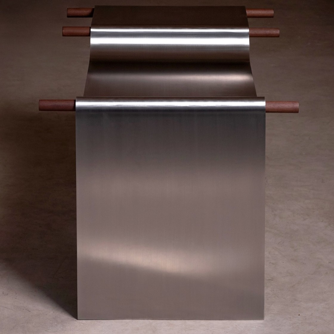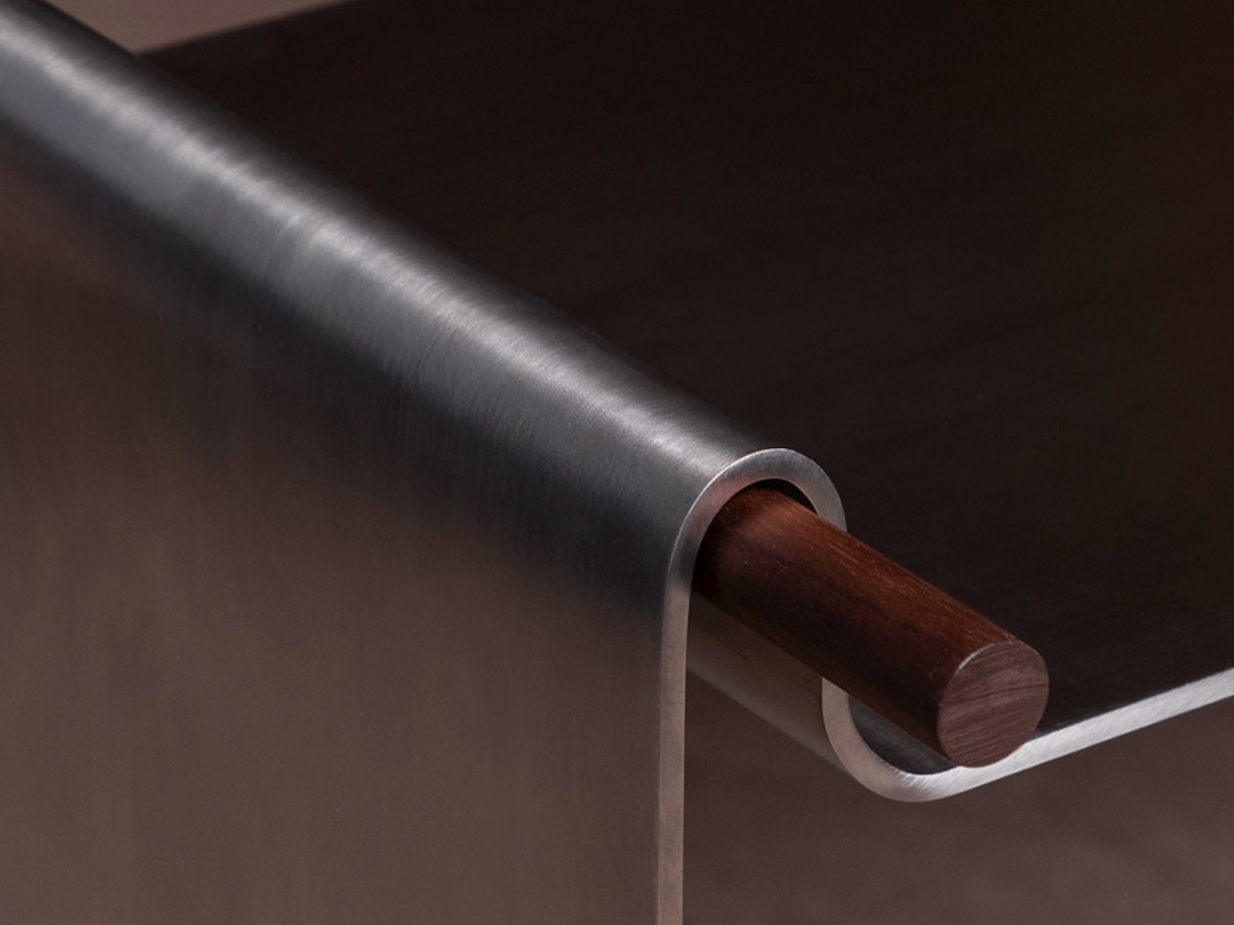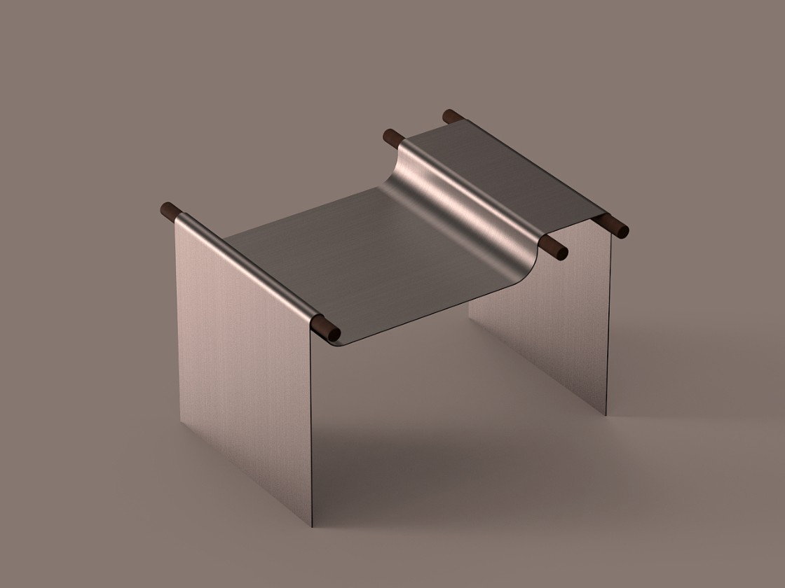 这是一款精心设计的金属材料凳子设计,传统小凳子设计的凳面材料无疑是纺织布匹,而这款凳子设计师别出心裁的采用了金属材质,巧妙的单张金属板弯曲成形,模仿布料优雅地悬挂在木棍上,创造出一种视觉感设计。