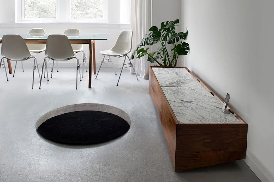 这是一款有趣的家用地毯设计,设计师采用了光学原理营造了一款视错觉的地毯,看起来就像你的地板上有一个圆形的洞,实现的原理是双色调的地毯采用黑色,带有新月形的灰色区域,看起来就像一个黑洞。