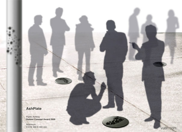这是一个外形类似普通烟灰缸的设计,它可以镶嵌在马路面,或者电线杆壁上也是个不错的想法。有了它,不仅解决了烟民们的苦恼,也减少了随地乱扔烟头的现象。环保化、人性化。