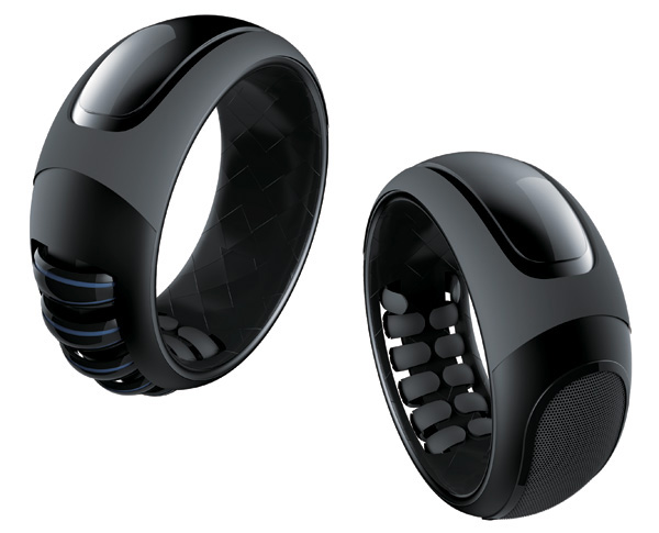 这个设计可以说是很贴心的设计,其使用时需要配戴在手指上,通过震动来唤醒使用者。其通过放置在设置板上来进行充电,而闹钟的时间设置也是在此托板上进行。而且两款戒指方便夫妻在不同时刻起床时使用,免得普通闹钟响时吵醒对方。