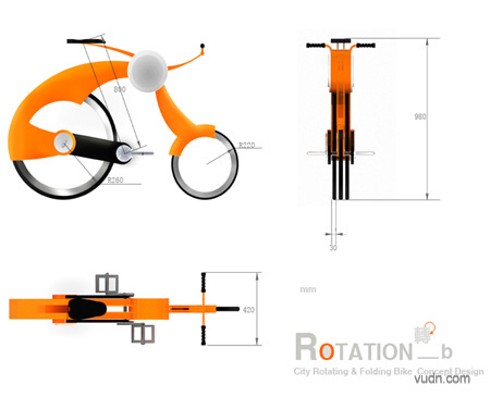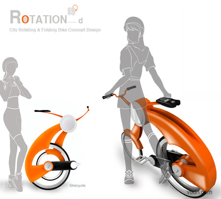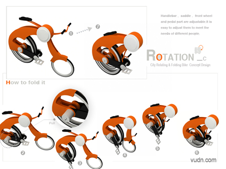 Rotation是国际自行车大赛上的一个概念自行车设计作品。该车最大的特点是能够自由的折叠成独轮脚踏车或是拆成两轮自行车。Rotation还能很容易的被拆卸和携带。这款概念折叠自行车设计通过拆卸,折叠来实现便携的元素设计,可以说是一款非常有亮点和新意的概念自行车设计。
