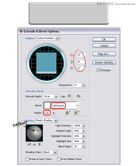 下图是我的设置值。更改”指定绕X轴旋转”值,在斜角中选择长圆形,将高度值从4pt更改为6pt,然后将光线稍微移向左侧。