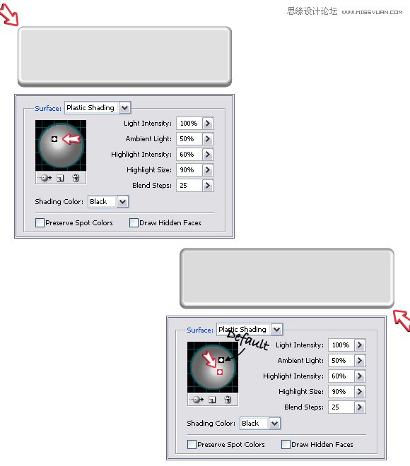 在凸出与斜角选项窗口中,点击更多选项按钮打开整个的对话框,注意底部的选项。如果你想加亮左上角,将光线移动到如下所示的上方,或者你想加亮右下角的话将其移动至下方。