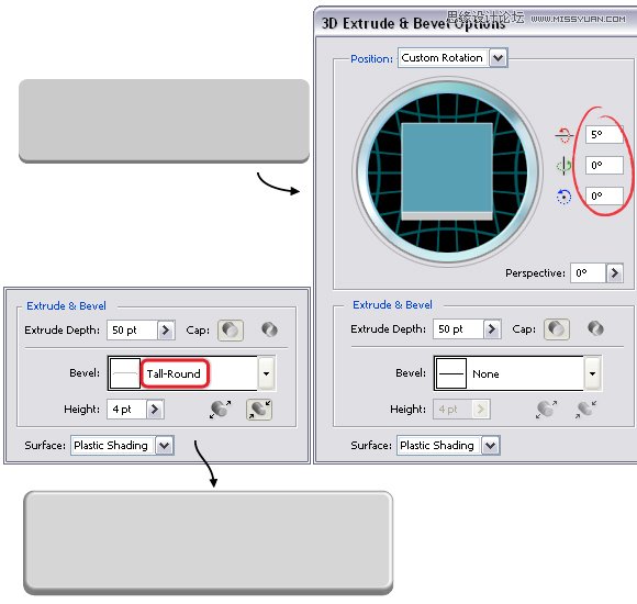 在此矩形选中的状态下,选择效果菜单》3D》凸出和斜角。在下图的右方你可以看到默认设置,只有”指定绕X轴旋转”的值有所改变。通常情况下我更愿意使用斜角形状,但有时不能得到让人满意的结果。在这个例子中,如果你选择”长圆形”作为斜角形状改变会更明显,边缘会更圆润,而且之后也不用担心高光和阴影的问题。