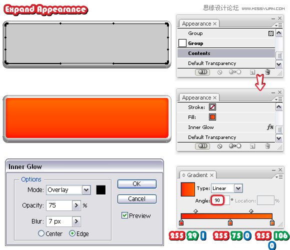 在3D按钮已经选择的情况下,选择对象》扩展外观命令,现在,使用直接选择工具(A)选择内部的圆角矩形,给它填充如下图所示的线性渐变。将角度设置为90度。在此矩形选中的状态下,在外观面板中双击内容(原因是这个形状是在编组中),这样你就能看到已经存在的属性。接下来,选择效果》风格化》内发光命令,使用如下所示的值。