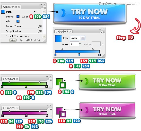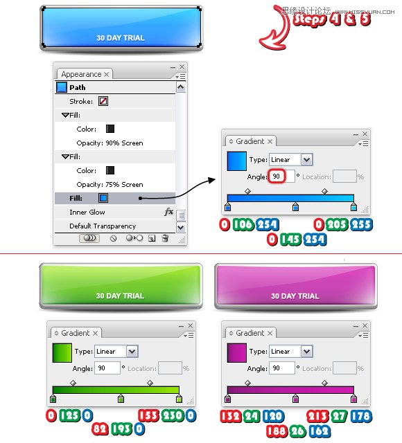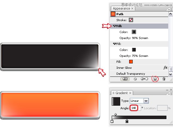 我们从圆角矩形开始。使用直接选择工具(A)选择它,并且查看一下外观面板。将第一个渐变填充更改为如下所示的新的渐变,其它属性不做修改。绿色和蓝色按钮也用同样的方法。