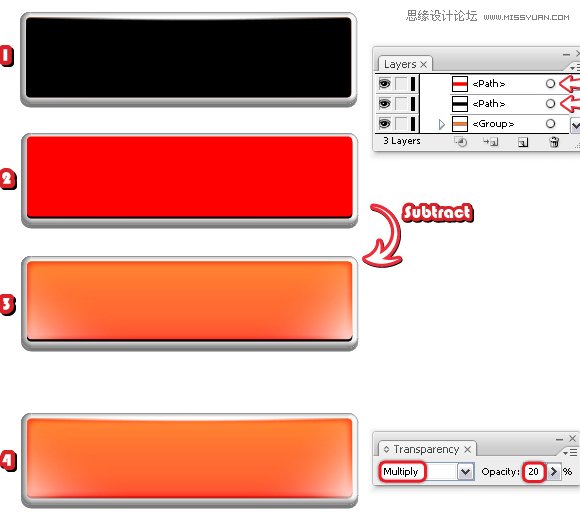 再一次拷贝粘贴内部的矩形,将其拖拽出按钮编组并放置于编组之前。移除已有的外观,将其填充为黑色(1)。现在,将黑色矩形拷贝粘贴到前面,更改填色,和黑色矩形区分开来。按下两次向上的方向建将红色矩形向上移动(2)。键盘的增加值应该设置为1像素(编辑菜单》首选项》常规)。