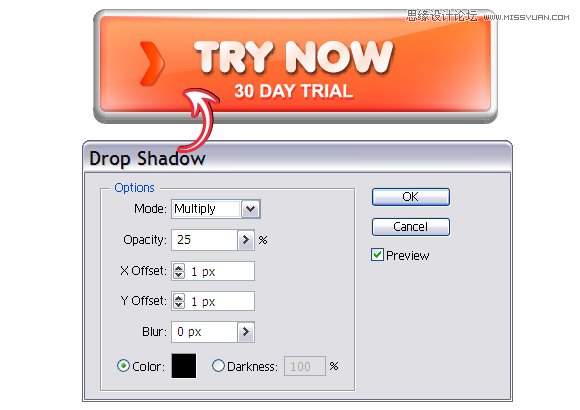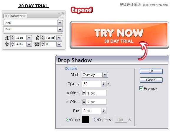 现在,键入”30 DAY TRIAL”,使用Arial字体,加粗,15pt大小,然后从对象菜单中选择扩展,然后给文字填充白色,再次添加如下图所示的投影效果。