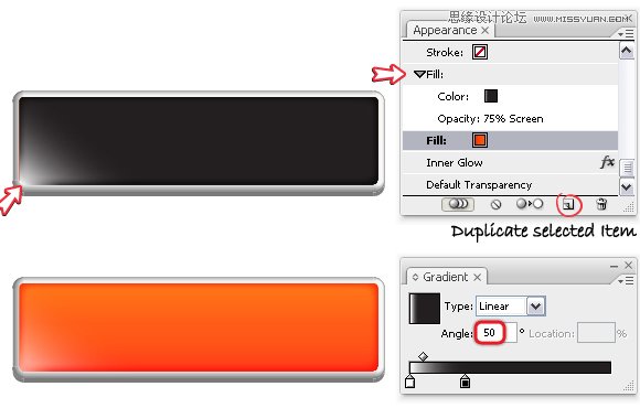 在外观面板中选择已有的填色,点击下方的”复制所选项目”图标,你会得到第二个填色,将渐变更改为黑白渐变,角度设置为50度。将混合模式更改为滤色,不透明度降低为75%。