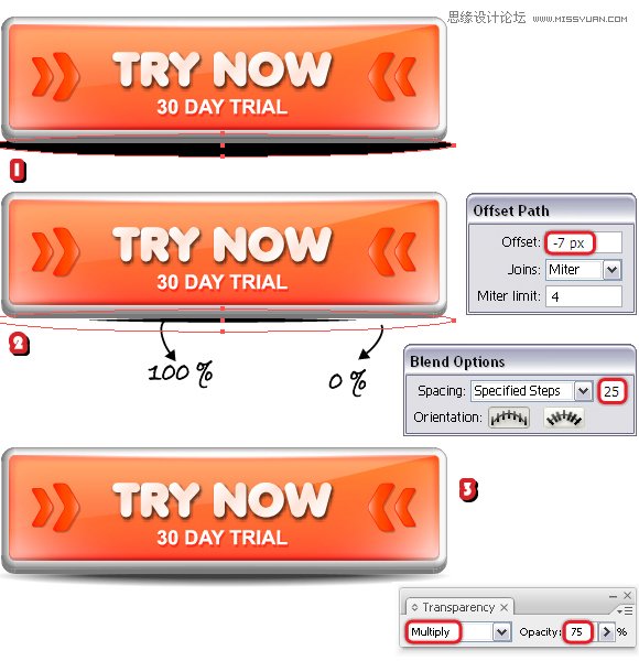 现在唯一缺少的就是按钮底部的阴影了。选择椭圆工具(L),在底部画出一个扁平的椭圆,填充颜色设置为黑色(1)。将此椭圆放置在按钮之后,然后选择对象菜单》路径》偏移路径,应用最少7个像素的偏移。你会在中间得到一个小一点的椭圆(2)。将大椭圆的不透明度设置为0%,然后将两个都选取上,选择对象菜单》混合》混合选项,选择25指定的步数,然后选择对象菜单》混合》建立(3)。将得到的混合编组的不透明度降低为75%,如果你将按钮放置于特别的背景上,也要将混合模式更改为正片叠底。