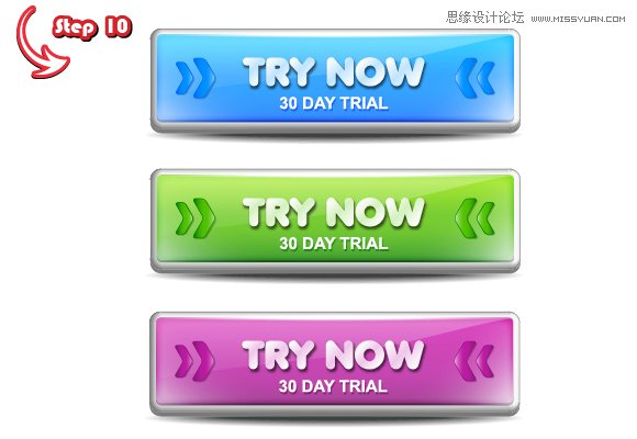 通过这个按钮的创建方法你可以得到其它不同的颜色。你需要做的就是将按钮拷贝一遍,做一点更改而已。在下面的图中你可以看到3个例子:蓝色、绿色和紫色。在下方所示的图中,所有可见的形状都没有更改,保持了它们的原貌。而那些隐藏的意味着将会被修改,我们一个一个来。