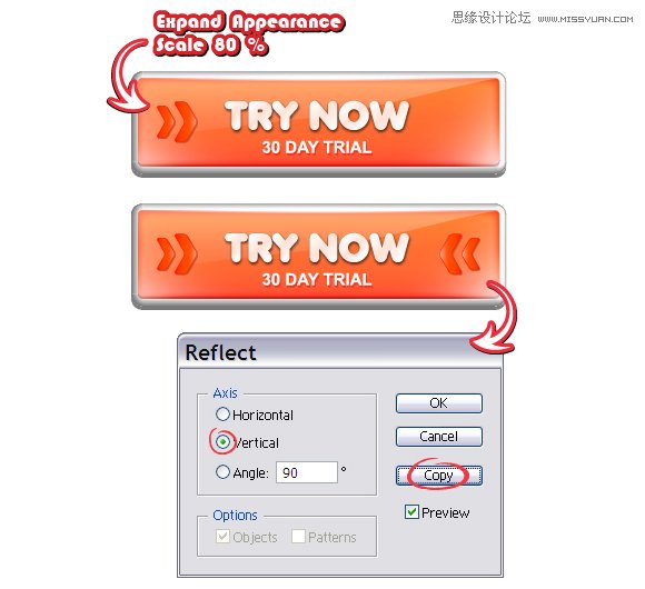 选中此箭头,在对象菜单中选择扩展外观,目的是将应用的两种效果扩展,然后选择对象菜单》变换》缩放,选择80%,点击复制。这样你会得到小一点的箭头。像下图所示那样放置它们,确保它们水平对其。将它们两个都选择上,然后选择对象菜单》变换》反向。选择垂直然后点击拷贝,将两个新建头放置在右侧,这样按钮就初步成型了。