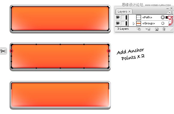 使用直接选择工具(A)选择内部的矩形,然后从对象菜单中选择复制粘贴到前面命令。在图层面板中将新矩形拖出按钮编组,因为我们不想让它放在那里。移除现有的属性,给它添加黑色的描边。在此矩形被选中的状态下,使用对象》路径》添加锚点命令两次增加额外的锚点。接下来,使用剪刀工具(C)在所示的两个点上点击两次,将形状剪短,然后删除底部的部分。