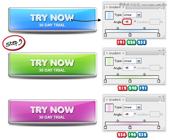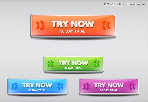 对于文字,简单的将渐变中间的颜色从浅橙色分别更改为浅蓝色,浅绿色和浅紫色。文字”30 DAY TRIAL”保持原貌。