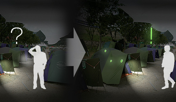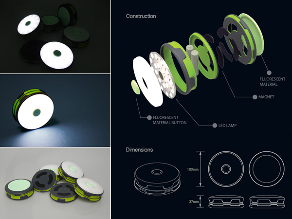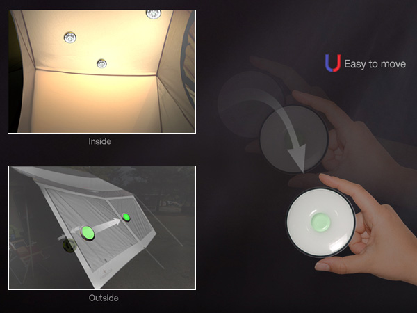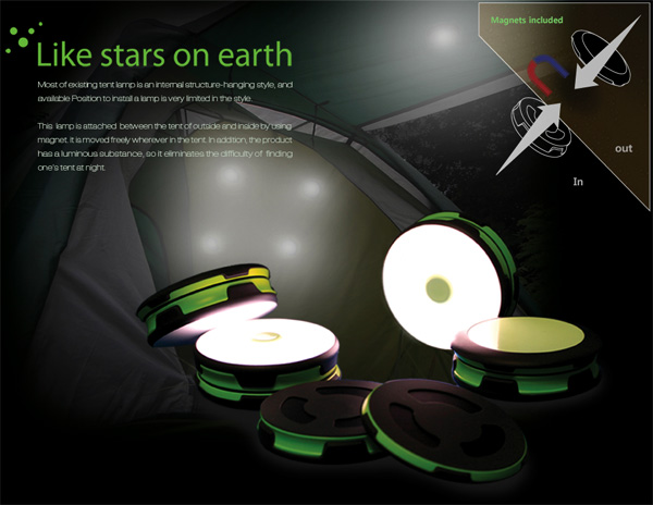 野营是一件非常时尚,非常普遍的活动,尤其是在夏天,很多人都不愿意呆在家里。但是当用户很多人在同一个地方露营的时候,就有可能遇到一个尴尬的情况——找不到自己的帐篷。大家的帐篷都很像,既不能直接进去确认,又不能从外面判断出来。为了避免这样的尴尬,帮助用户快速找到自己的帐篷,Yu Yunjo和Kim Seunghyun设计了这个星光灿烂帐篷灯。它是由一对具有强力磁性的LED灯组成的,可以通过磁性分别吸在帐篷的外侧和内侧。这样既可以照亮帐篷的内部,又可以通过外面的灯分辨出自己的帐篷。如果调低亮度,增加数量,它就会为用户营造一个星空的气氛,温馨而又美丽。