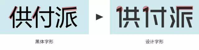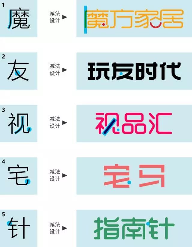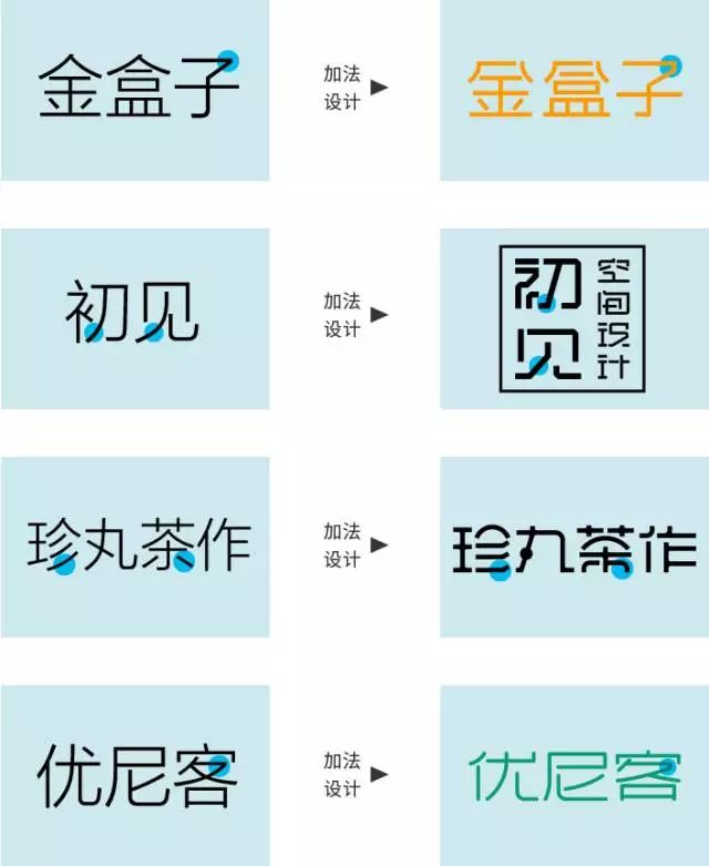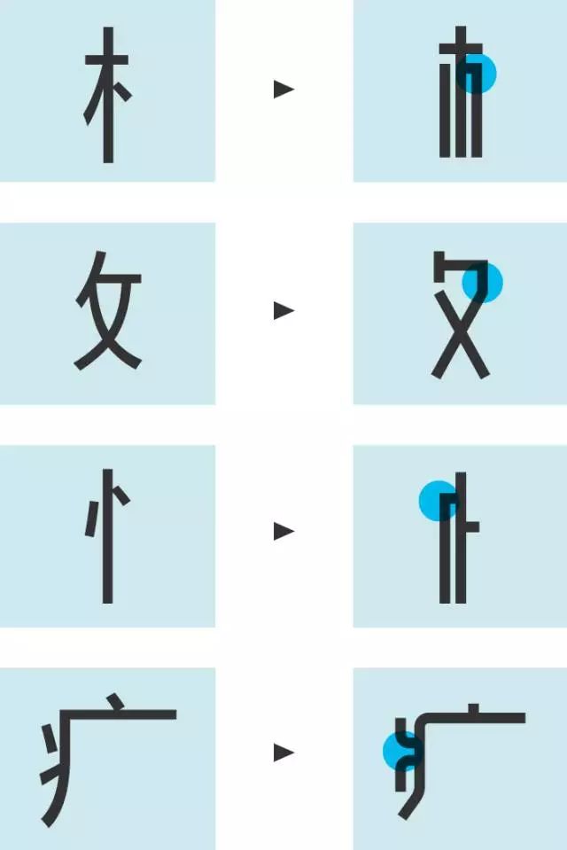 上图几例案例,右侧的设计字形中,蓝色标注笔画,都是经过了“加法”设计,在“撇”、“捺”、“点”的笔画里,以及“撇”和“横”的交接笔画里,这样的设计处理,非常实用。和之前的“减法”有所区别,给笔画做“加法”,其变形方式和规律是大体类似的,于是,我们得到这样一个结论: